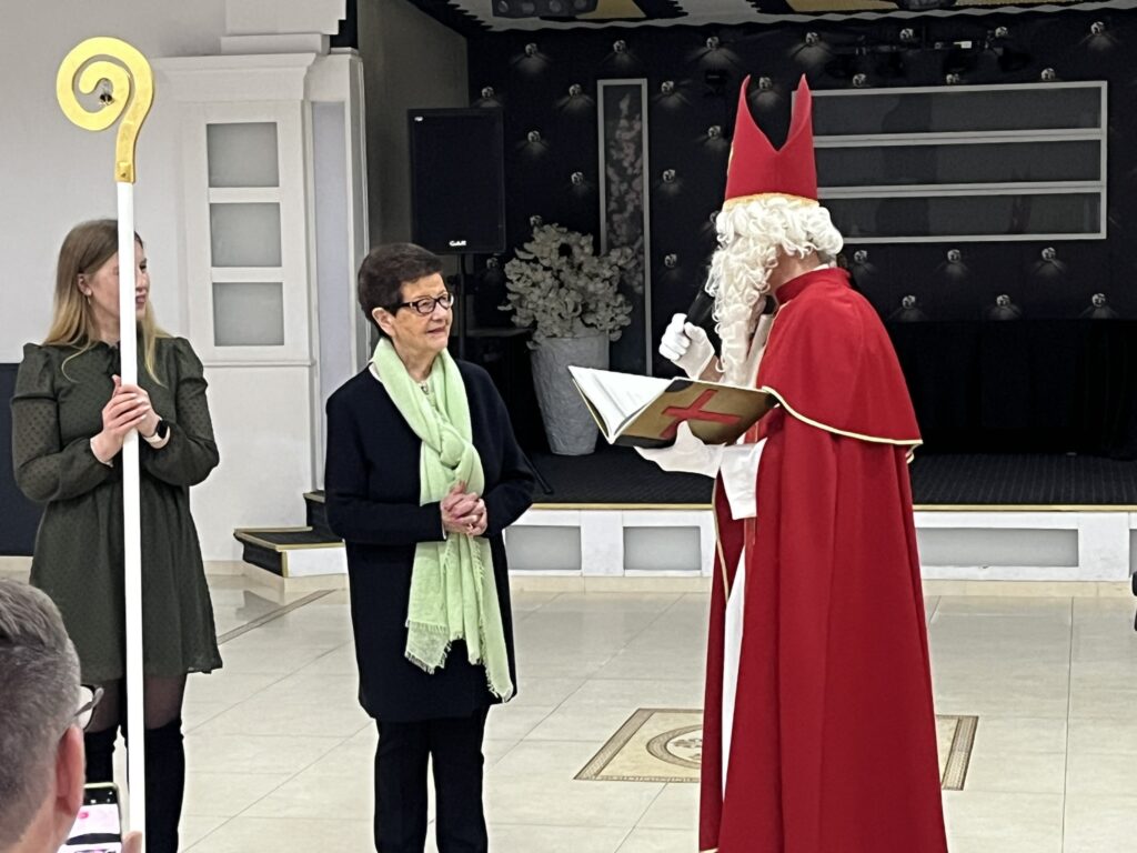 Dieser hatte in seinem goldenen Buch viele gute Taten von einigen anwesenden Personen aufgeschrieben. Als erstes ehrte der heilige Nikolaus die Schirmherrin der Tafel, Frau Stenau, die immer ein offenes Ohr für alle Belange der Tafel hat und diese schon seit mehr als 15 Jahren immer wieder unterstützt. Mit einem Blumenstrauß wurde das mit großem Dank anerkannt. Auch andere Personen wurden nach vorne gerufen. Diese „d u r f t e n“ ein Gedicht aufsagen oder ein Lied singen. Mit vielen gemeinsamen Liedern sowie einem Abschiedslied für den Nikolaus ging der Vormittag in gemütlicher Runde zu Ende.