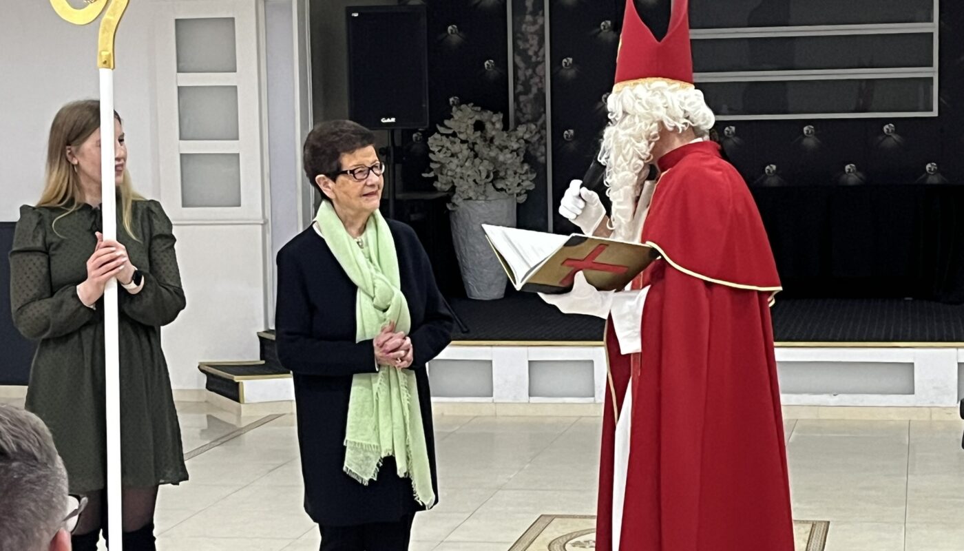 Dieser hatte in seinem goldenen Buch viele gute Taten von einigen anwesenden Personen aufgeschrieben. Als erstes ehrte der heilige Nikolaus die Schirmherrin der Tafel, Frau Stenau, die immer ein offenes Ohr für alle Belange der Tafel hat und diese schon seit mehr als 15 Jahren immer wieder unterstützt. Mit einem Blumenstrauß wurde das mit großem Dank anerkannt. Auch andere Personen wurden nach vorne gerufen. Diese „d u r f t e n“ ein Gedicht aufsagen oder ein Lied singen. Mit vielen gemeinsamen Liedern sowie einem Abschiedslied für den Nikolaus ging der Vormittag in gemütlicher Runde zu Ende.